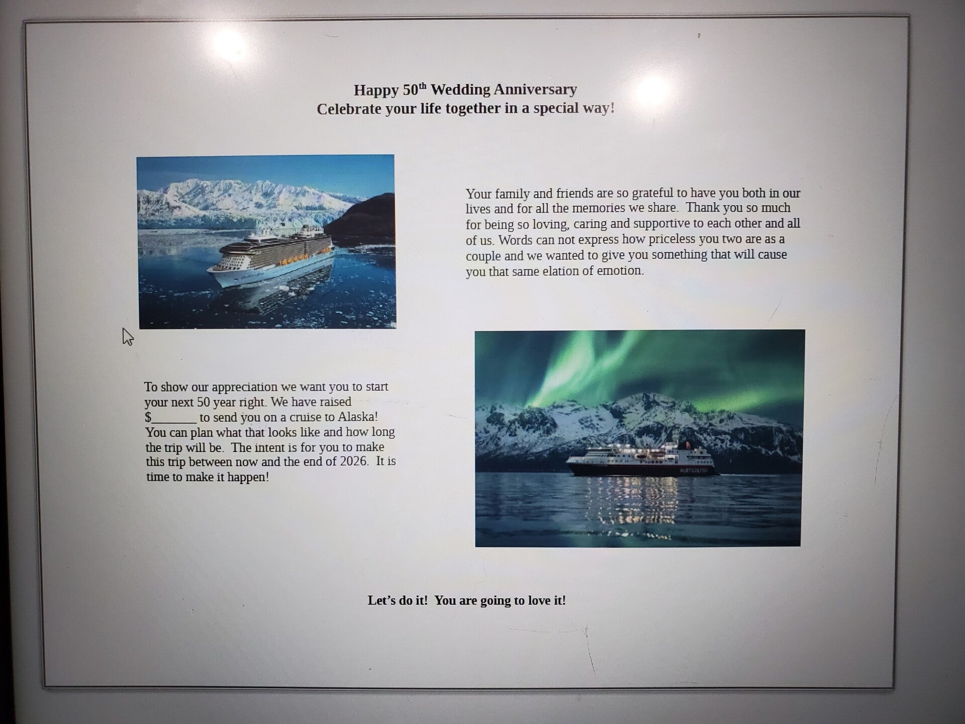 We fully expected a lecture that night after everyone left.  But it never came.  I think we shocked them!  They seemed to understand the intention behind the gift.  We all knew they could afford to take the trip themselves, but they never had!  We did this to take away all the no's. The family and friend push is strong!  We all want them to finally do something big for themselves.  Create more memories!  Enjoy themselves more!