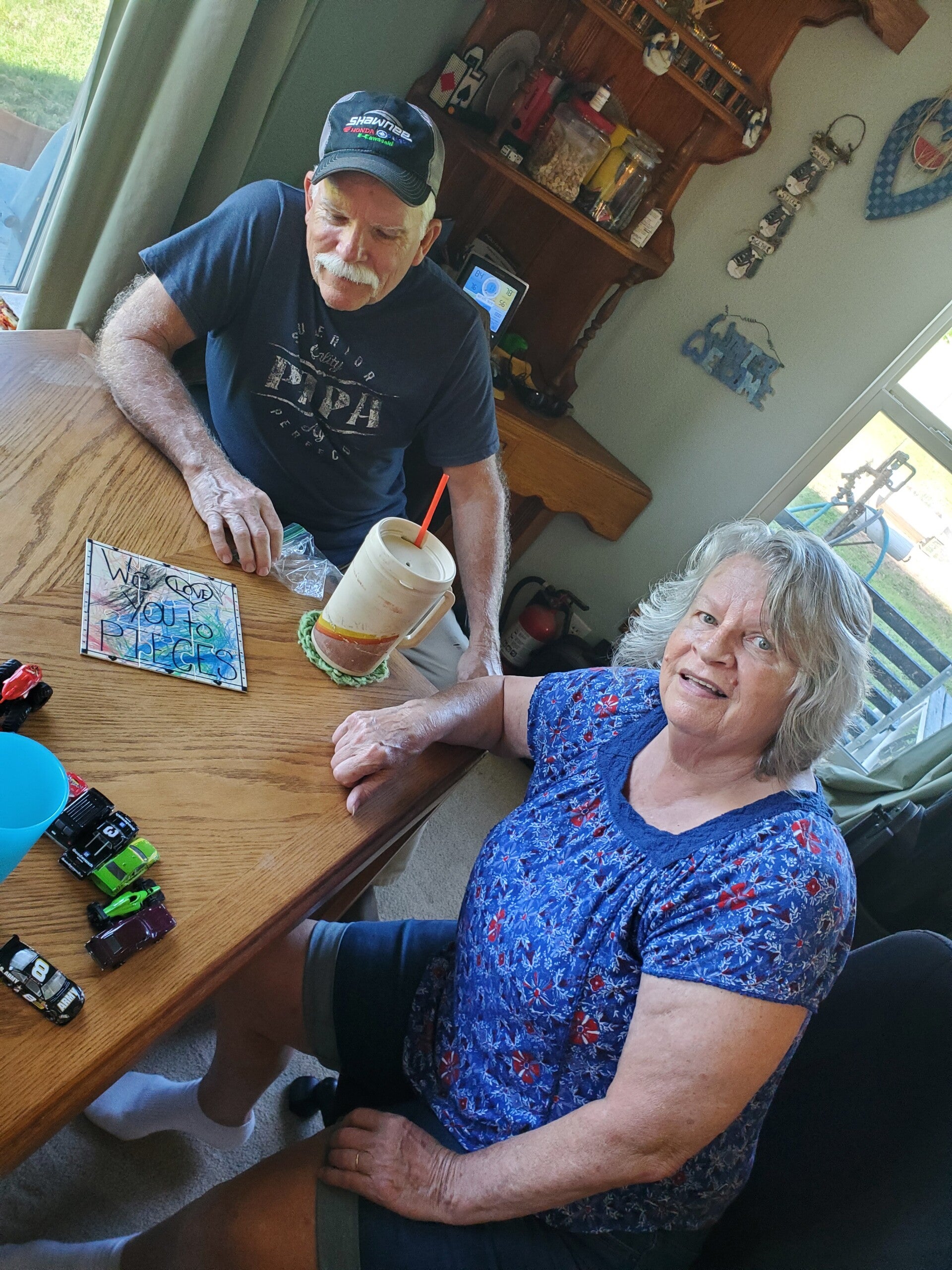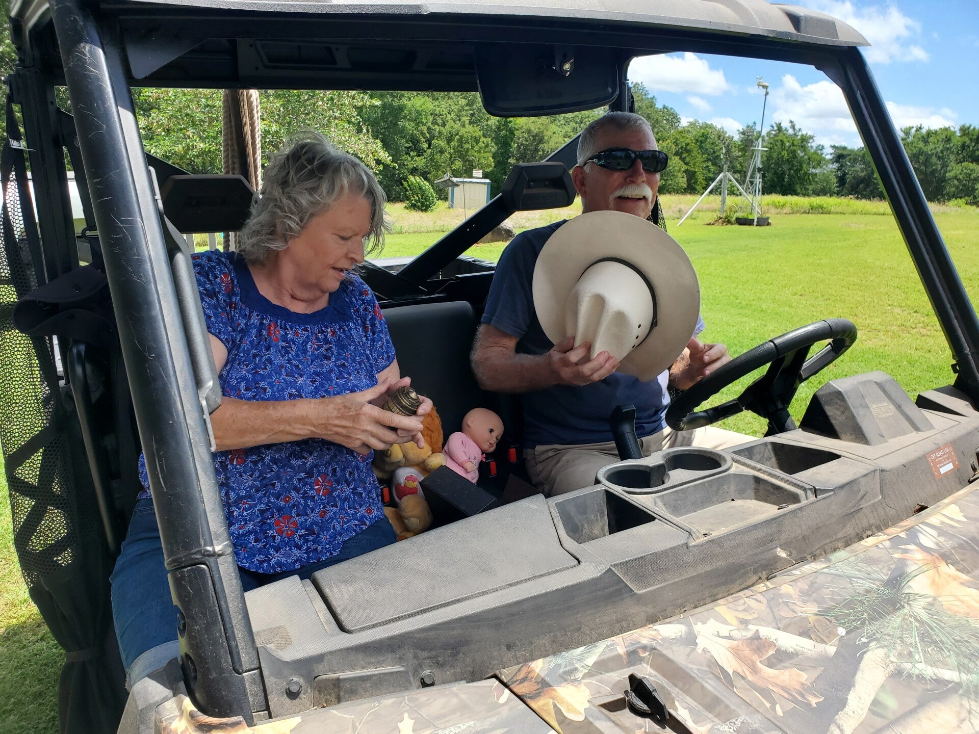 Then the parental units opened up their gift. It was the scrapbook with all your pictures and photos. Under the scrapbook was a note letting them know the scavenger hunt had started!  They were both given instructions and sent off into the heat. Mom jumped onto the 4 wheeler and Dad into the ranger.
