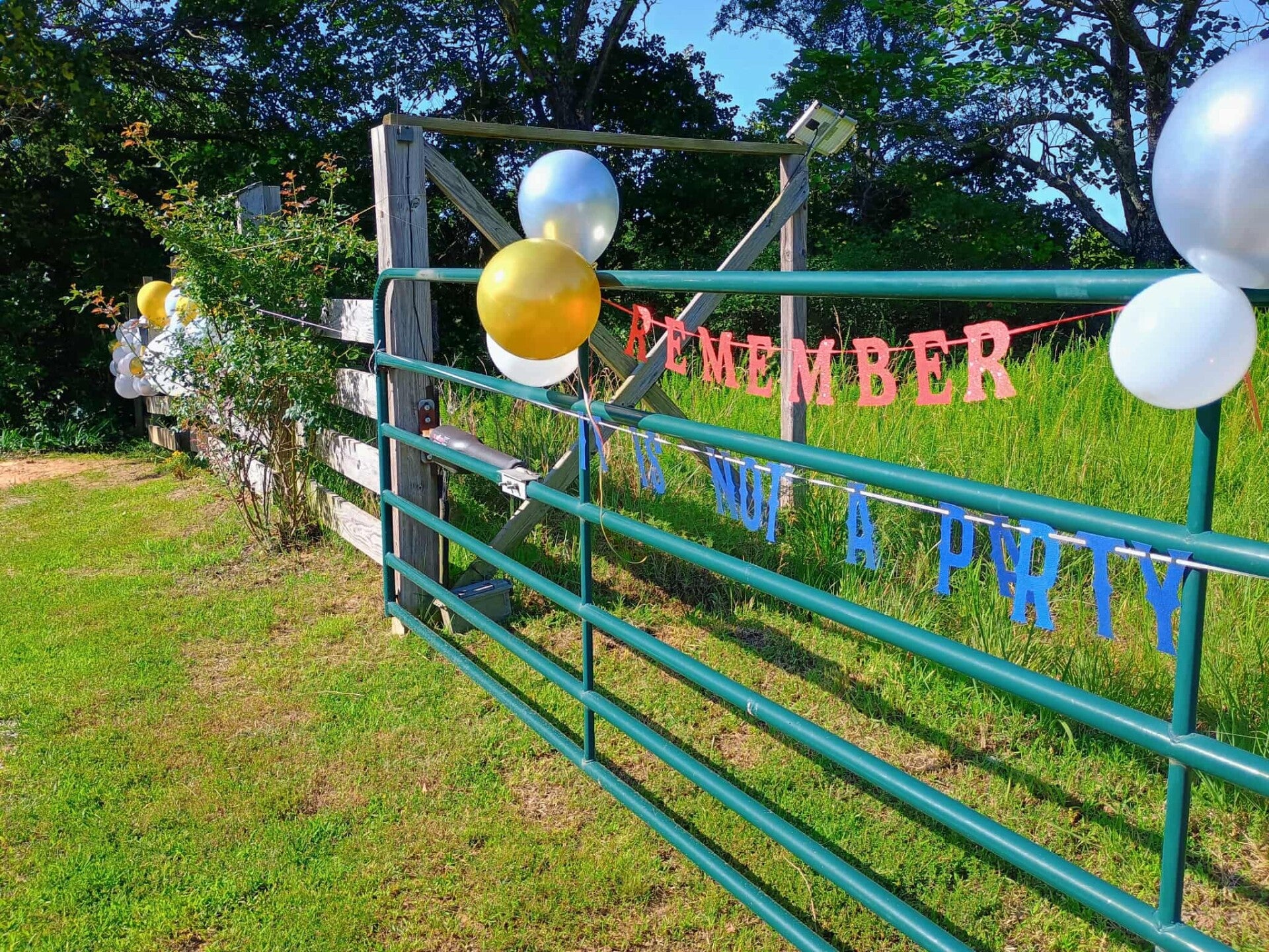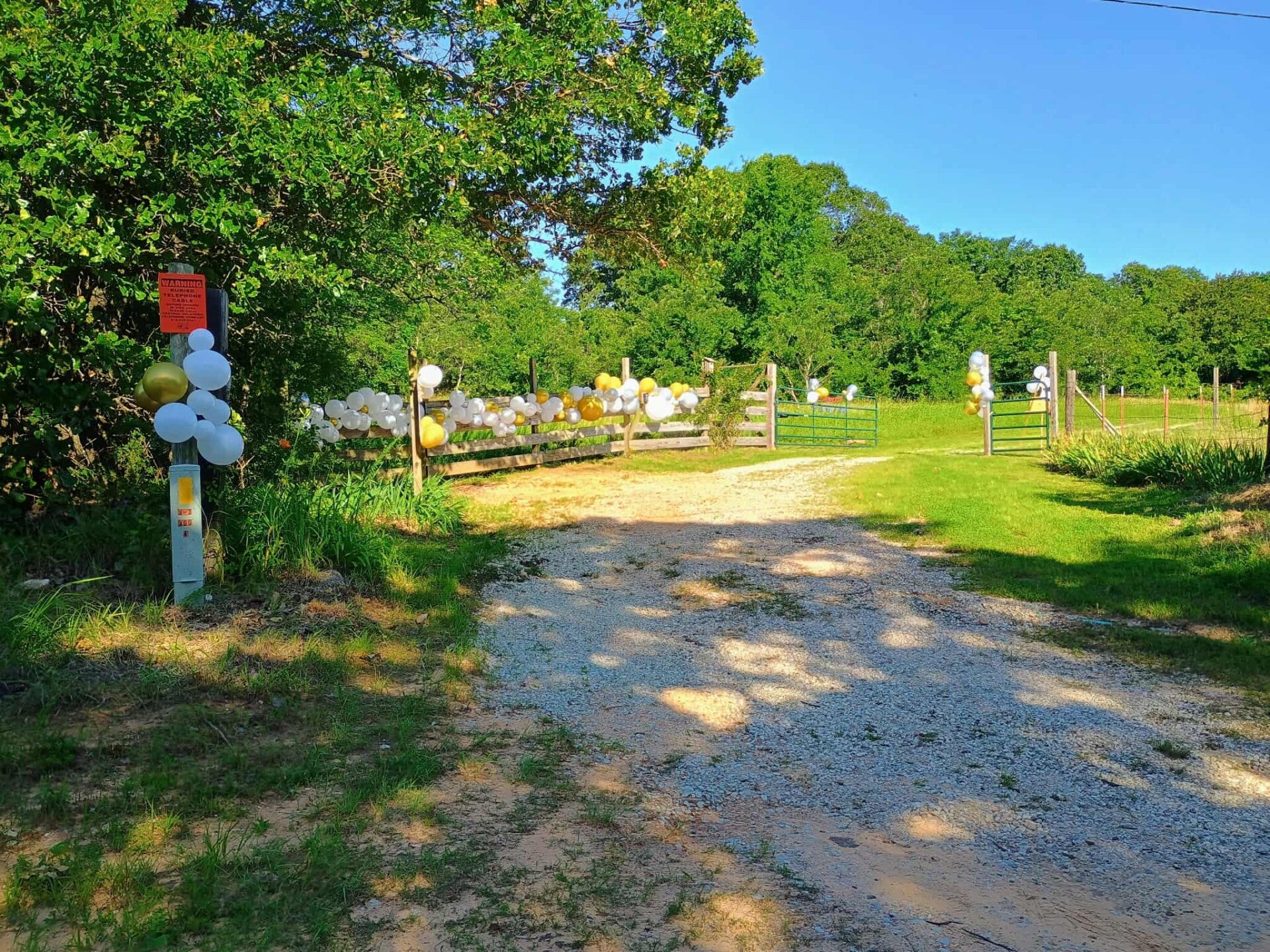 They had no idea at the time what we were already planning.  So Wade, Shelby, Cliff, and I got to work figuring out how to integrate the scrapbook reveal and the Alaskan gift with Dad's photo get-together.  We were not allowed a party at The Ranch, but he didn't specifically say we couldn't have a party at the gate!  So early Saturday morning, we all snuck down to the gate and about 200 balloons were attached to the gate, fence line, mailbox, and various posts. A picture of the couple appeared, blown up in full BIG glory, and we prepared a scavenger hunt around the land for them.